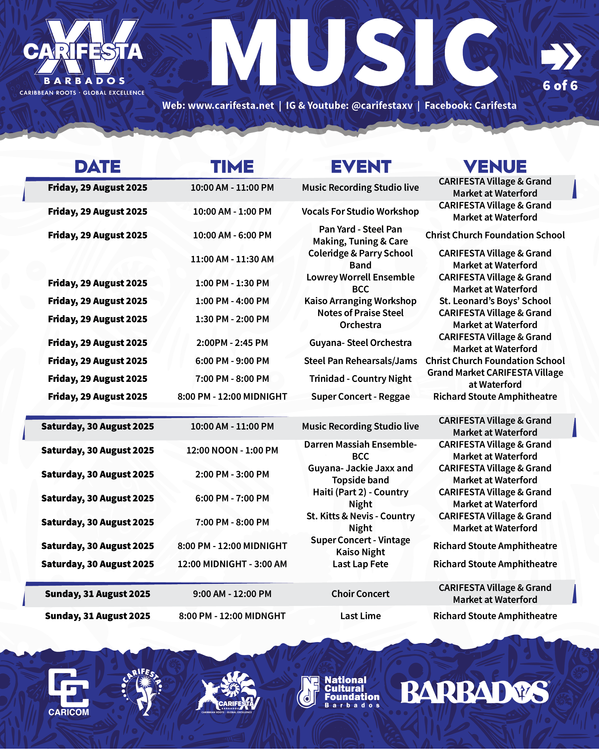 The programme features live concerts, immersive workshops, spiritual gatherings, and spaces for both seasoned artists and emerging talent to shine. With a focus on collaboration, innovation, and cultural pride, the music events will reflect the region’s unique stories through song and sound. Whether you’re in a sunrise gospel session, a late-night pan jam, or witnessing tomorrow’s stars take the stage, CARIFESTA XV’s music experience promises to move you-body, mind, and